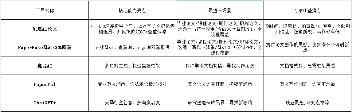 谁用它最爽?看真实场景: 毕业论文焦虑星人: 我的亲学妹,计算机专业,面对庞杂的代码和实验文档无从下笔。笔启AI的“长文记忆”和“代码支持”功能救了命,帮她理清逻辑,把算法描述和实验结果串联成文,导师一次就通过了初稿结构! 她终于能睡个安稳觉了。 赶课程论文的“DDL战士”: 我朋友小明,社会学专业,教授临时加码一篇5000字书评。他把核心书籍章节和课堂笔记喂给笔启AI,3小时就产出了结构清晰、观点明确还带自己思考痕迹的初稿,轻松拿A!省下时间研究小组作业不香吗? 冲击核心期刊论文的科研人: 李博士(材料方向)实验数据一流,但英文写作是硬伤。他用笔启AI的英文模板和润色功能,结合自己“投喂”的领域顶刊文献,终于把论文语言提升到发表水平,成功中了心仪的二区期刊! 他说省下的翻译润色费都够吃顿大餐了。 职称论文的“时间管理大师”: 王老师(高校讲师)教学行政忙成狗,职称论文一直没空写。她用笔启AI的“文献综述”功能快速梳理研究脉络,结合自己的教学案例,高效完成了符合职称要求的实证论文框架和初稿,终于赶上申报末班车。 二、PaperFake降AIGC&降重:专业降AI,支持主流检测引擎专业降AI,查重率、aigc率双重担保 作为一款专注于AI智能写作辅助的创新平台,“PaperFake”自上线以来,凭借高效、智能的功能吸引了大批用户。在过去的5个月里,平台不断进行技术升级和优化,以更好地服务于用户的多样化需求。如今,我们很高兴地向大家介绍全新功能:PaperFake降AIGC全新模型上线,这个功能旨在为博士同学们提供论文创作的灵感,发掘潜在科研创新点。     三、魔匠AI:万能“学术工具箱”,花式生成小能手! 魔匠AI像个百宝袋,功能多到眼花缭乱!除了基础论文生成,还能搞定开题报告、课题申报、PPT大纲、甚至项目申报书!特别适合需要快速搭建各种学术文档框架,或者找点不同写作角度灵感的同学。 适用谁: 需要快速搞定多种学术文本格式的你!想一键获得不同写作风格的你!辅助完成课程作业、项目材料的效率追求者!   四、PaperPal:英文写作“语法纠察兵”,润色抛光小能手!如果你主攻国际发表,PaperPal值得一看!它专精于英文论文的语法修正、术语建议、风格优化(学术风 vs 简洁风),能显著提升语言的地道性和专业性。检查拼写、标点、时态错误更是快准狠。但核心还是“语言医生”,在论文的深度研究支持、逻辑构建、中文写作和查重保障方面,就不是它的战场了。 适用谁: 被英文写作折磨到秃头的你!投稿前需要最后语言润色的你!想让论文语言更native的你!   五、ChatGPT (Plus):天马行空“灵感喷泉”,头脑风暴好搭档!大名鼎鼎的GPT-4(需订阅Plus),绝对是激发灵感的王者!给它一个模糊想法,它能给你十个研究方向;卡文了?它能提供意想不到的角度。但!它像个才华横溢却有点粗心的朋友:生成内容可能“编造”参考文献,逻辑有时会跑偏,专业性需你火眼金睛把关,且超长文本连贯性挑战大。直接用于严肃学术写作风险较高,更适合前期探索。 适用谁: 需要疯狂头脑风暴的你!寻找创新研究点的你!不介意花大量时间筛选、验证和重组的你!(免费版3.5能力差距大,慎用)  横向对比表:5款AI自动生成论文工具,谁是你的天选搭子?  结语:论文季生存指南——选对AI论文写作工具,告别焦虑!实测一圈下来,笔启AI论文在解决学术写作核心痛点上确实稳——尤其是它那“投喂学习”让AI真正懂你课题、“长文记忆”保逻辑不崩、“降重降AIGC双重保障”,这三个功能给人实在是太多的安全感了,对于要产出高质量、能过关、甚至想发表论文的朋友来说,简直是定心丸!别再一个人对着空白文档死磕了,善用工具是高效学术的必备技能!无论是赶课程作业/毕业论文的本科萌新,还是冲刺顶级期刊论文的研究大佬,笔启AI都能给你实实在在的助力。