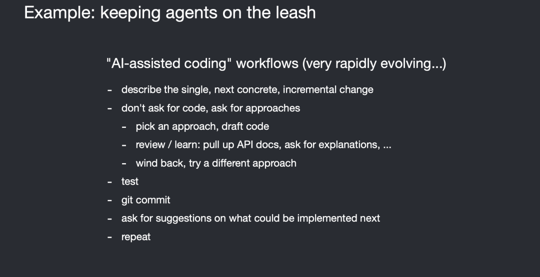- 控制 AI 行为的范围(“牵好绳子”):现在很多人对 AI Agent 太激动了。但你看,比如一次性给我生成一个包含 1 万行代码的 diff 并不实用。我作为人类仍然是瓶颈,我必须确认没有引入 bug、逻辑正确、安全无虞等等。所以必须控制 AI 的主动程度。