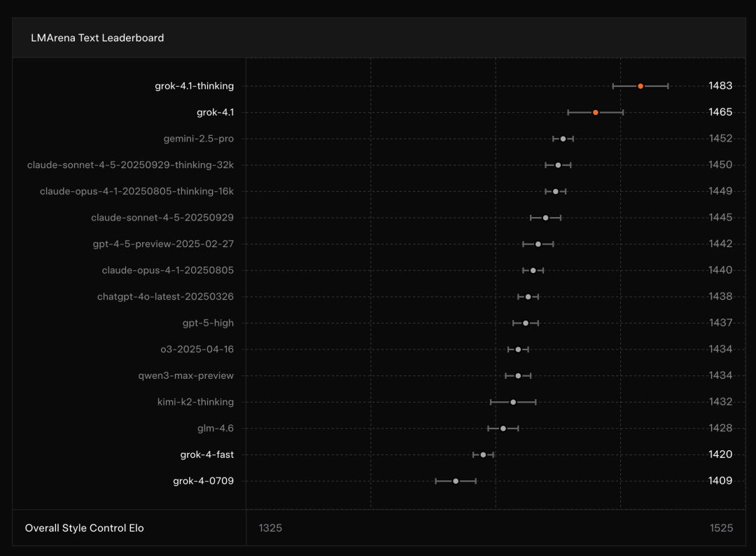 就在这样一个竞争最激烈的公开擂台上,xAI 的 Grok 4.1 系列拿下了极具含金量的一次 “双冠”:Grok 4.1 Thinking 版以 1483 Elo 拿下冠军,而非推理版 Grok 4.1 也以 1465 Elo 获得亚军。