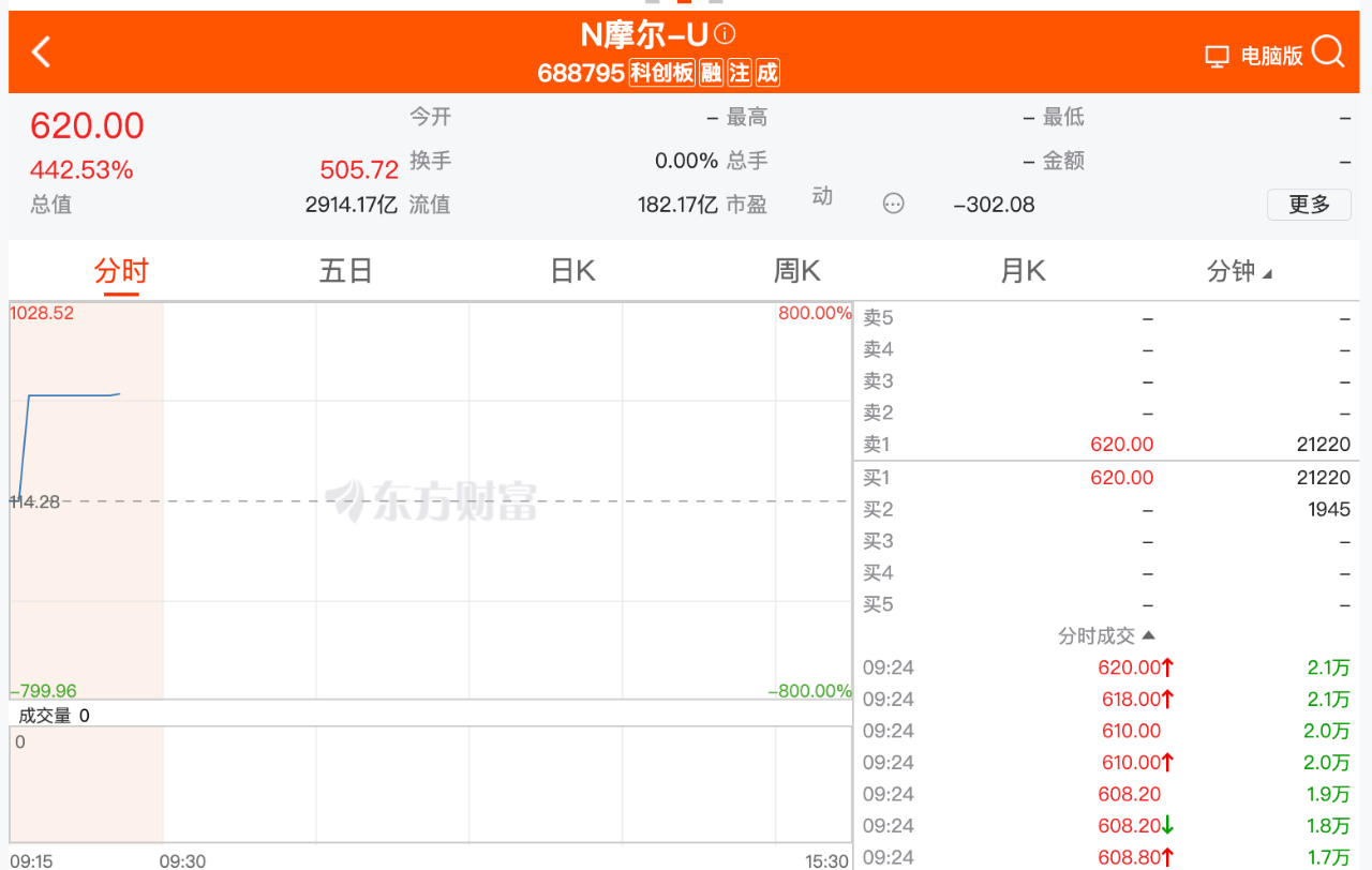 今天早上,国产 GPU 企业摩尔线程智能科技(北京)股份有限公司(以下简称“摩尔线程”)正式在科创板挂牌上市,发行价为 114.28 元,股票代码为 688795,截至发稿前,摩尔线程股价已经涨至620元/股,总股本 47002.8217 万股,市值已经破 2800 亿元。