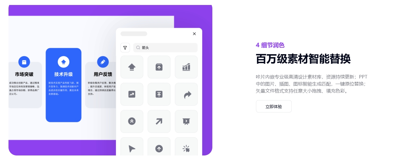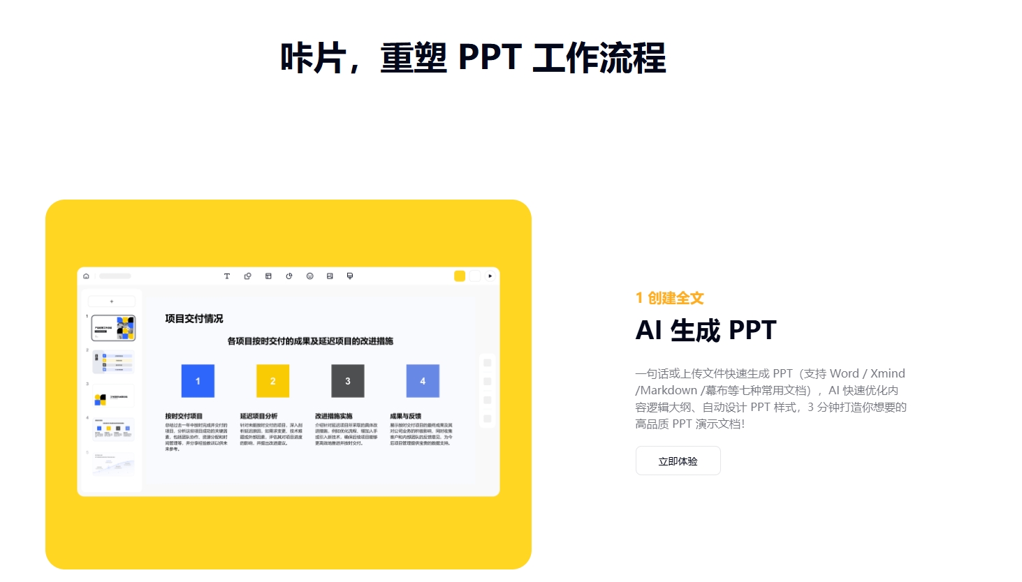 咔片是一款由AI深度赋能的PPT在线制作工具,支持AI一键生成、导入文档生成以及上传模板生成PPT,内置超10w+专业级模板素材,助力用户快速产出高质量PPT!